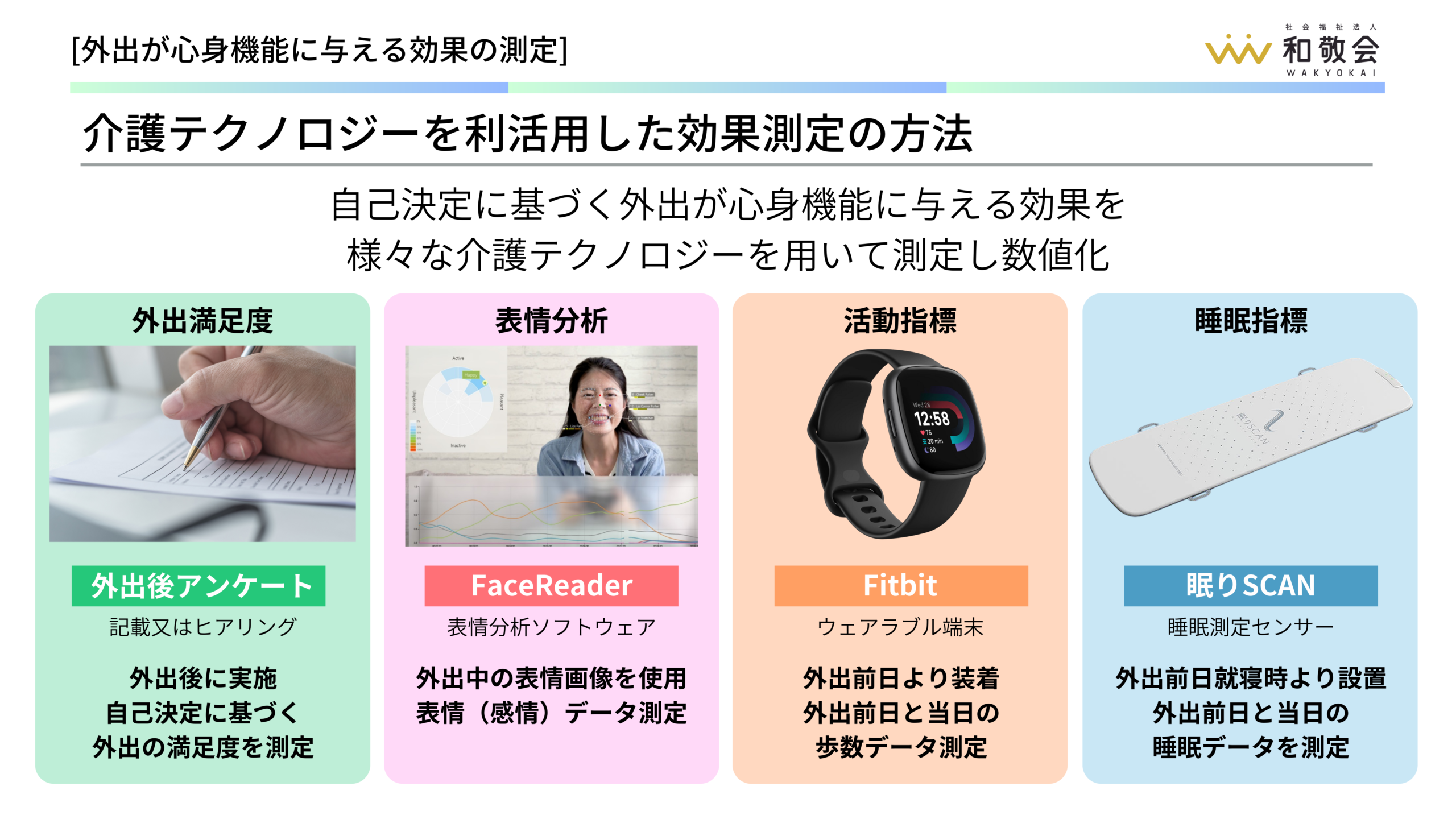 更にこの時、利用者様やご家族にご協力いただき、ただ外出をするということだけでなくFitbitや睡眠センサー、表情分析ソフトといったテクノロジーをフル活用して、外出が心身にどんな影響を与えるかを検証しました 。