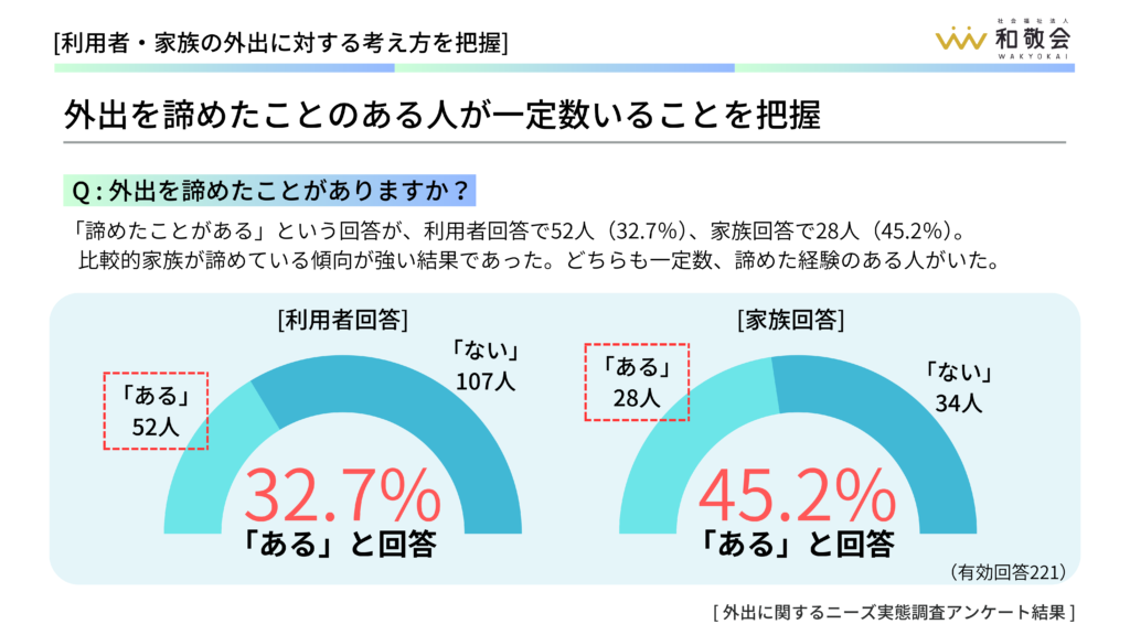 私たちが利用者様やご家族にアンケートを取ったところ、意外な事実が見えてきました。 「外出したいけれど、体の負担を考えると無理だと諦めている」という方が、約4割もいらっしゃったのです 。
